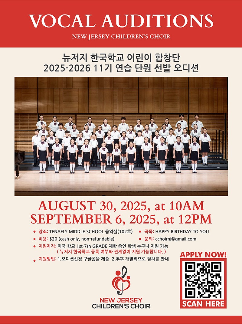 뉴저지어린이합창단에서 2025-2026 새 학기 연습 단원을 모집합니다. 아래 내용을 확인해 주시고 많은 지원 부탁드립니다. ->오디션 일정 8월 30일(토) 오전 10시 9월 6일(토) 오후 12시 ->장소 Tenafly Middle School 음악실(102호) ->오디션 곡명 HAPPY BIRTHDAY TO YOU ->비용 $20 (현금만 가능, 환불 불가) ->지원 자격 미국 학교 1st~7th Grade 재학 중인 학생 누구나 가능 ( ✔️뉴저지 한국학교 등록 여부와 관계없이 지원 가능합니다) ->지원 방법 1.오디션 신청 구글폼 제출 https://forms.gle/sCBXLb7TBuPDtWeV7 2.추후 개별적으로 절차 안내 예정 ->문의 cchoirnj@gmail.com 감사합니다.